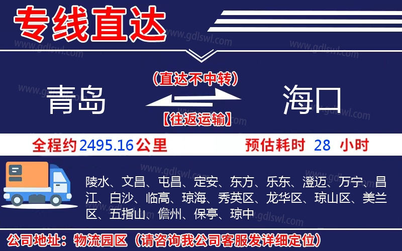 青島到??谖锪鲗>€是一條連接青島和海口的貨物運輸線路,由陸順物流公司提供直達不中轉(zhuǎn)運輸服務(wù),能為企業(yè)、工廠、貿(mào)易商以及個人提供高效、便捷、可靠的貨運解決方案