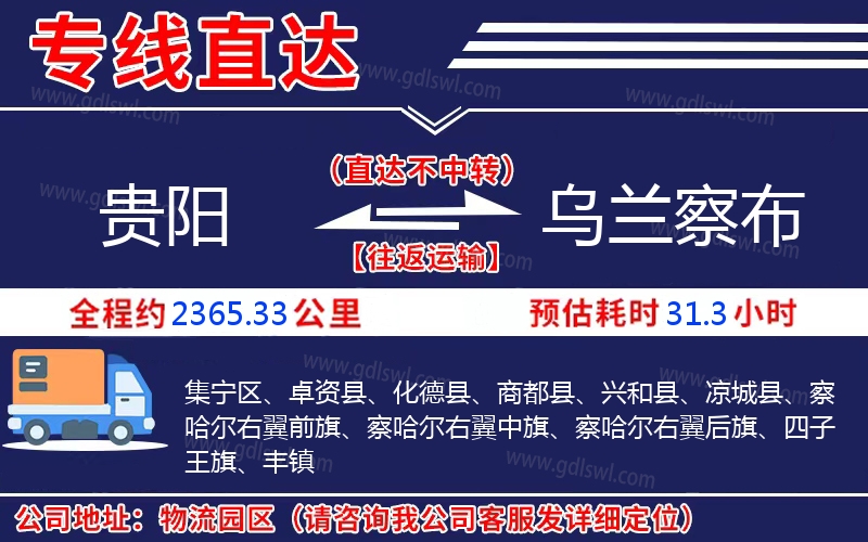 貴陽到烏蘭察布物流專線是一條連接貴陽和烏蘭察布的貨物運輸線路,由陸順物流公司提供直達不中轉(zhuǎn)運輸服務,能為企業(yè)、工廠、貿(mào)易商以及個人提供高效、便捷、可靠的貨運解決方案