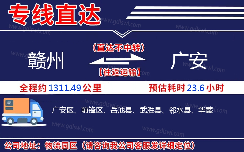 贛州到廣安物流專線是一條連接贛州和廣安的貨物運輸線路,由陸順物流公司提供直達不中轉(zhuǎn)運輸服務,能為企業(yè)、工廠、貿(mào)易商以及個人提供高效、便捷、可靠的貨運解決方案