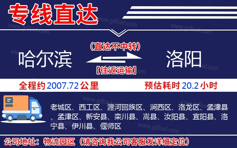 哈爾濱到洛陽物流專線是一條連接哈爾濱和洛陽的貨物運輸線路,由陸順物流公司提供直達不中轉(zhuǎn)運輸服務(wù),能為企業(yè)、工廠、貿(mào)易商以及個人提供高效、便捷、可靠的貨運解決方案